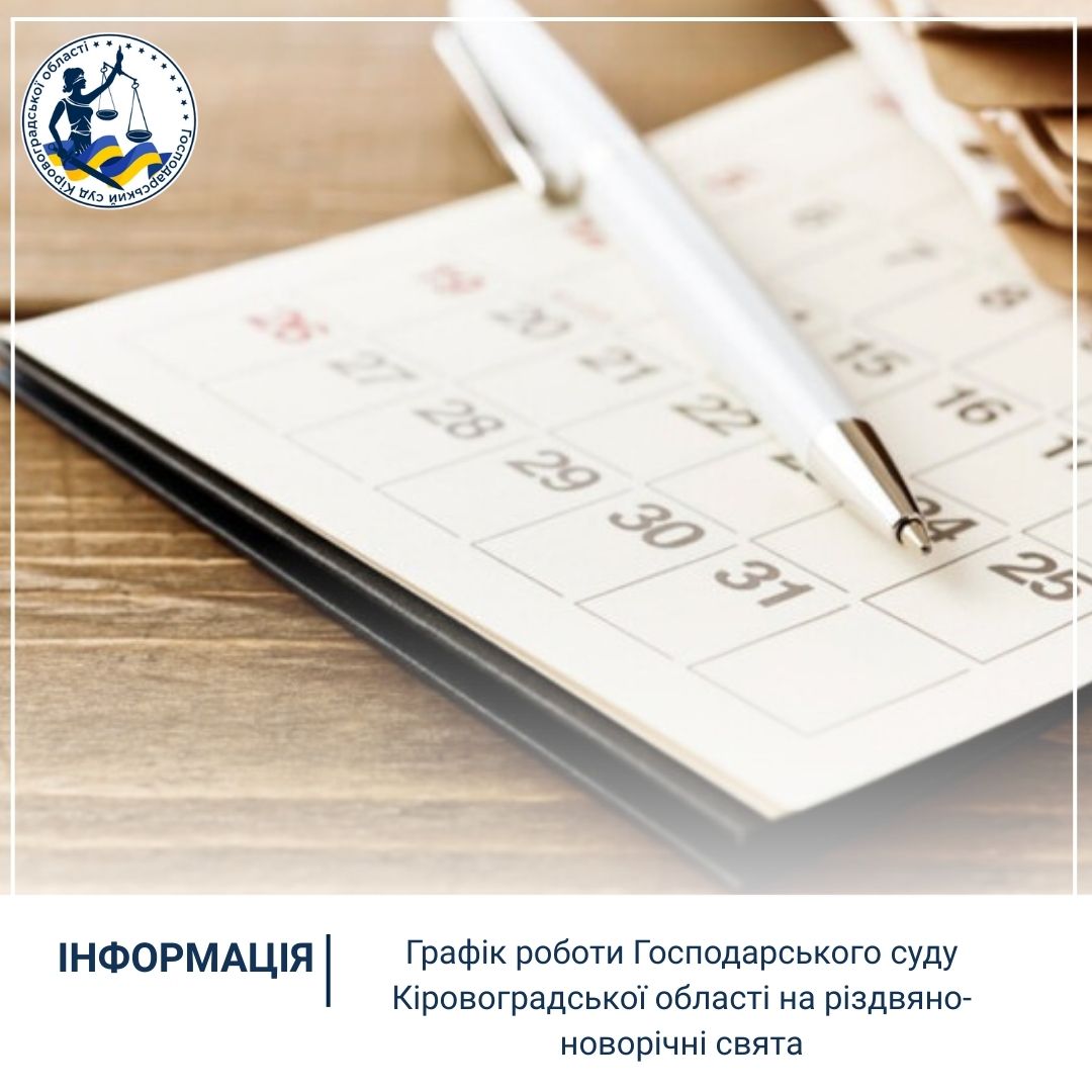 Звертаємо Вашу увагу на графік роботи Господарського суду Кіровоградської області під час різдвяно-новорічних свят!