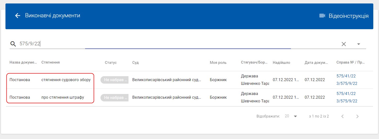 У розділі відображаються виконавчі документи (рішення, постанова, судовий наказ, тощо) у вигляді списку. Доступні пошук і фільтрація (зокрема за датою надходження).